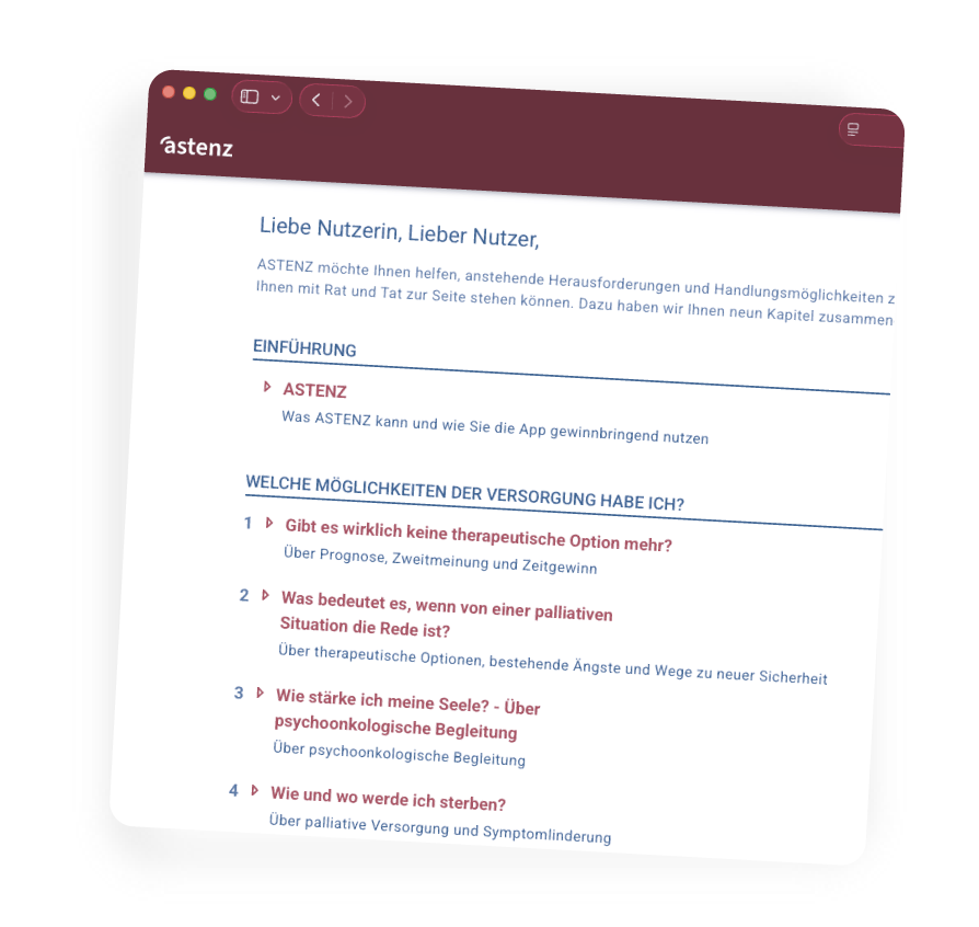 Mit ASTENZ bieten wir eine App für Smartphone, Tablett und PC an, die niederschwellig Erfahrungen, praktische Tipps und Orientierung im Umgang mit schweren Krebserkrankungen teilt.
